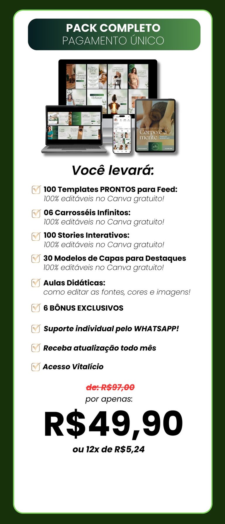 Desbloqueie instantaneamente mais de 200 modelos exclusivos do Canva Massoterapia, totalmente editáveis no Canva gratuito, e faça do seu Instagram um imã poderoso de clientes!